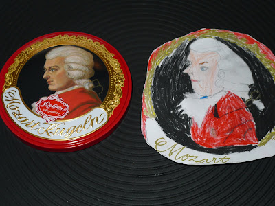 Hugo som Mozart med notblad i handen, Hektor som Karl XVI Johan. Den svarta mössan ska föreställa en peruk :)